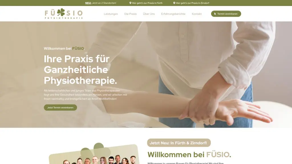 FÜSIO sind zwei Praxen in Zirndorf und Fürth, mit herausragenden Bewertungen und einem Team an jungen und dynamischen Physiotherapeuten. Hier haben wir die komplette Website umgesetzt inkl. aller Inhalte (inkl. Grafikdesign und Texte) und uns um die einwandfreie technische Umsetzung gekümmert.