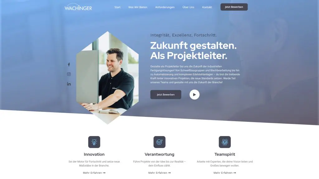 Wachinger Recruiting ist auf die Gewinnung von Projektleitern im Bereich industrieller Fertigung spezialisiert. Hier haben wir das komplette Design der Website sowie die technische Umsetzung realisiert und waren auch bei der Texterstellung beteiligt. Wichtig war das interaktive Bewerbungsformular mit gezielten Fragen.